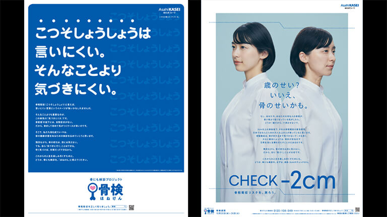 自覚症状の出にくい骨粗鬆症を防ぐため、わずか人口の5%しか受けていない骨密度検診を促す「骨検プロジェクト」を企画制作。身長低下で骨粗鬆症リスクが上がることに着目し「Check -2cm」運動を推進。