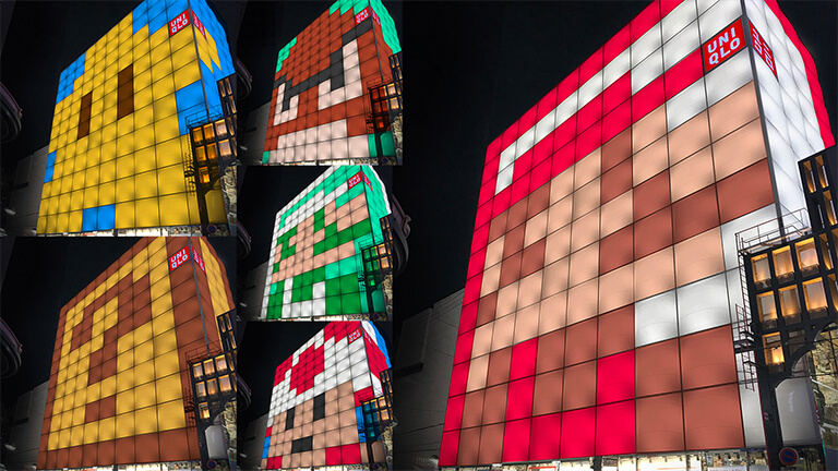 UTとマリオのコラボ告知として、大阪心斎橋にあるUNIQLO店舗の外壁がLEDライトであることに着目。発売前夜から2週間で様々なキャラクターを出現させた。広告予算を一切使うことなく店舗のLEDのみで日本中での話題化を達成し、売上UPに貢献。紙袋も合わせて制作した。