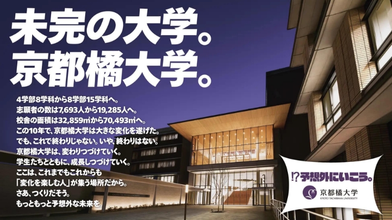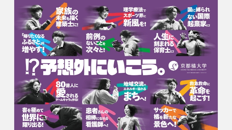 京都橘大学の新ブランドコミュニケーション。「変化を楽しむ人であれ。」を掲げ、国際、人文、教育、社会、看護・医療系と多様な学部が集う総合大学に急成長し、2021年に一気に3学部新設。予想外な未来を、予想外な速度で生み出す唯一無二な大学のコンセプトに仕立てました。