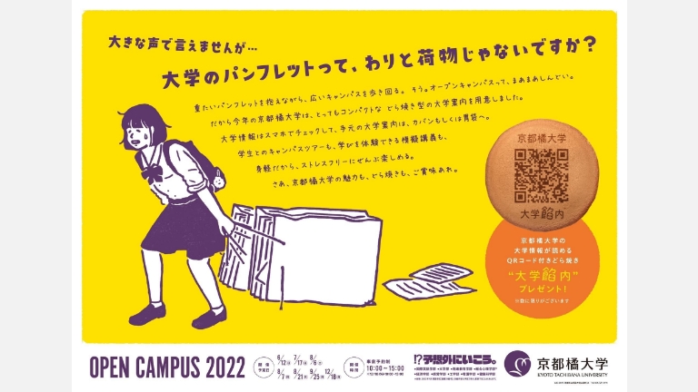 オープンキャンパスの告知は、どの大学もプログラムの説明が盛り沢山。内容はWEBで見たら良いものと割り切り、あえて配布グッズの「大学餡内」をメインに、オープンキャンパスに一石を投じつつ、興味関心を高める狙いで広告を掲出。