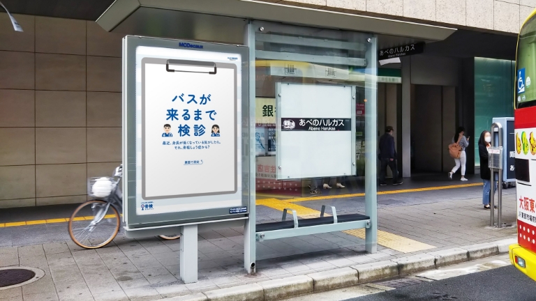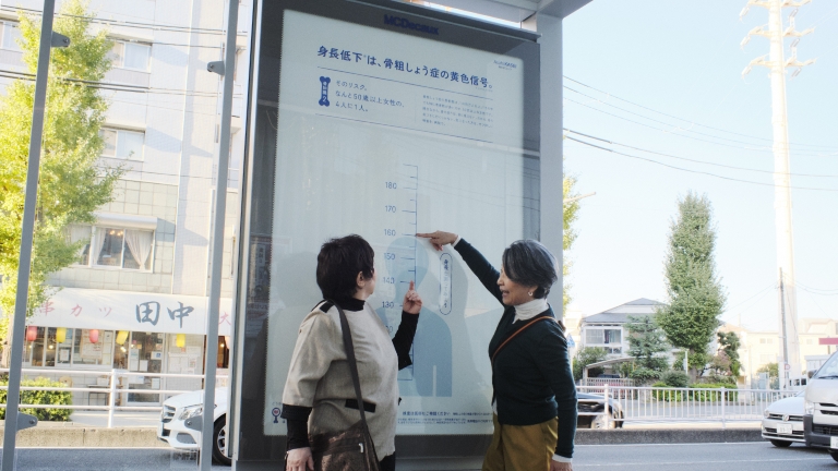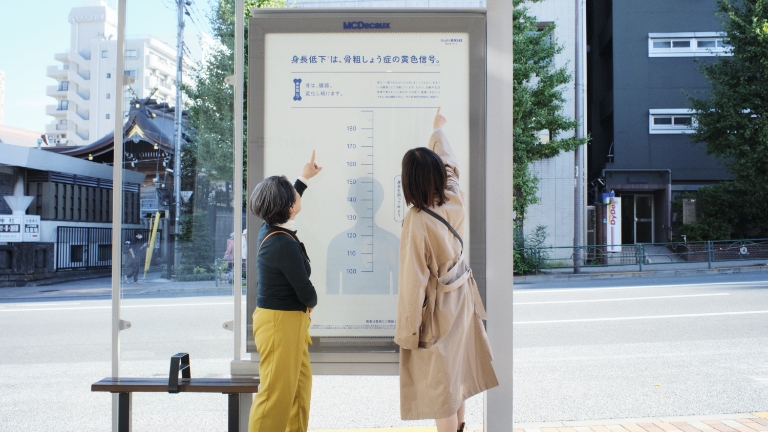 骨粗鬆症は自覚症状が出にくく、身長低下が1つのサイン。バスを利用している世代と、骨粗鬆症リスクの高い世代が類似していることから、バス停を身長計に見立てたセルフチェック検診の場に。全国15都市47箇所のバス停で実施。
