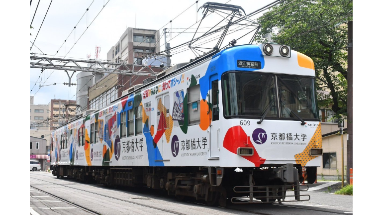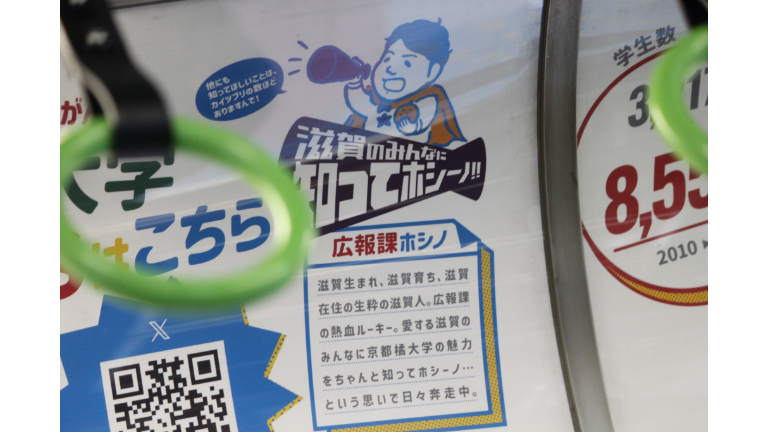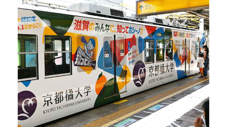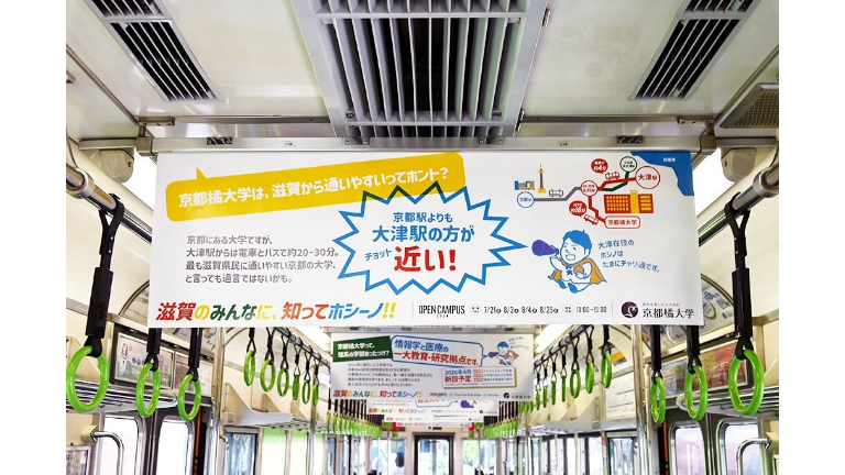 滋賀県に最も近い京都の大学が京都橘大学。事実、滋賀県民の認知は最も高い。でも、変わり続ける大学だからこそ最新の特徴も届けたい。広報課のホシノさん(実在人物)を企画にし、京阪石山坂本線の電車をジャック。滋賀の街を1年間走ります。